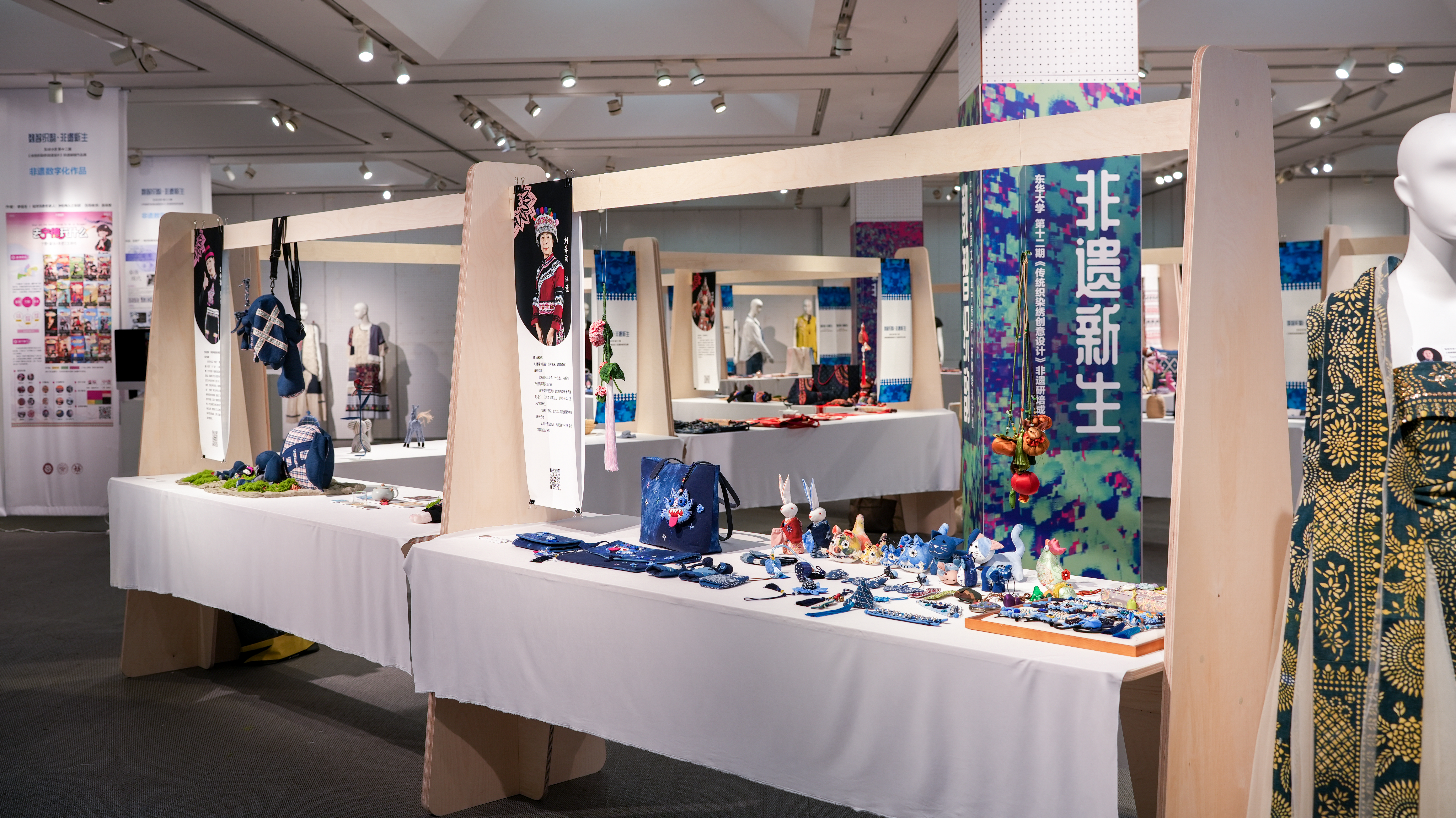 《数智织韵·非遗新生》非遗服饰文创与数字艺术联展同期在校举办,展出400余件具有代表性的传统织染绣面料和纹样样本,以及学员设计创作的服装服饰、文创产品等,把傣族织锦、阜阳刺绣、畲族服饰、上海药斑布印染、崇明土布编织等非遗技艺巧妙融入家居装饰、服饰箱包、国潮周边、IP形象等设计中,还有学员与企业进行合作或计划量产研培作品,实现文化传承的商业落地。